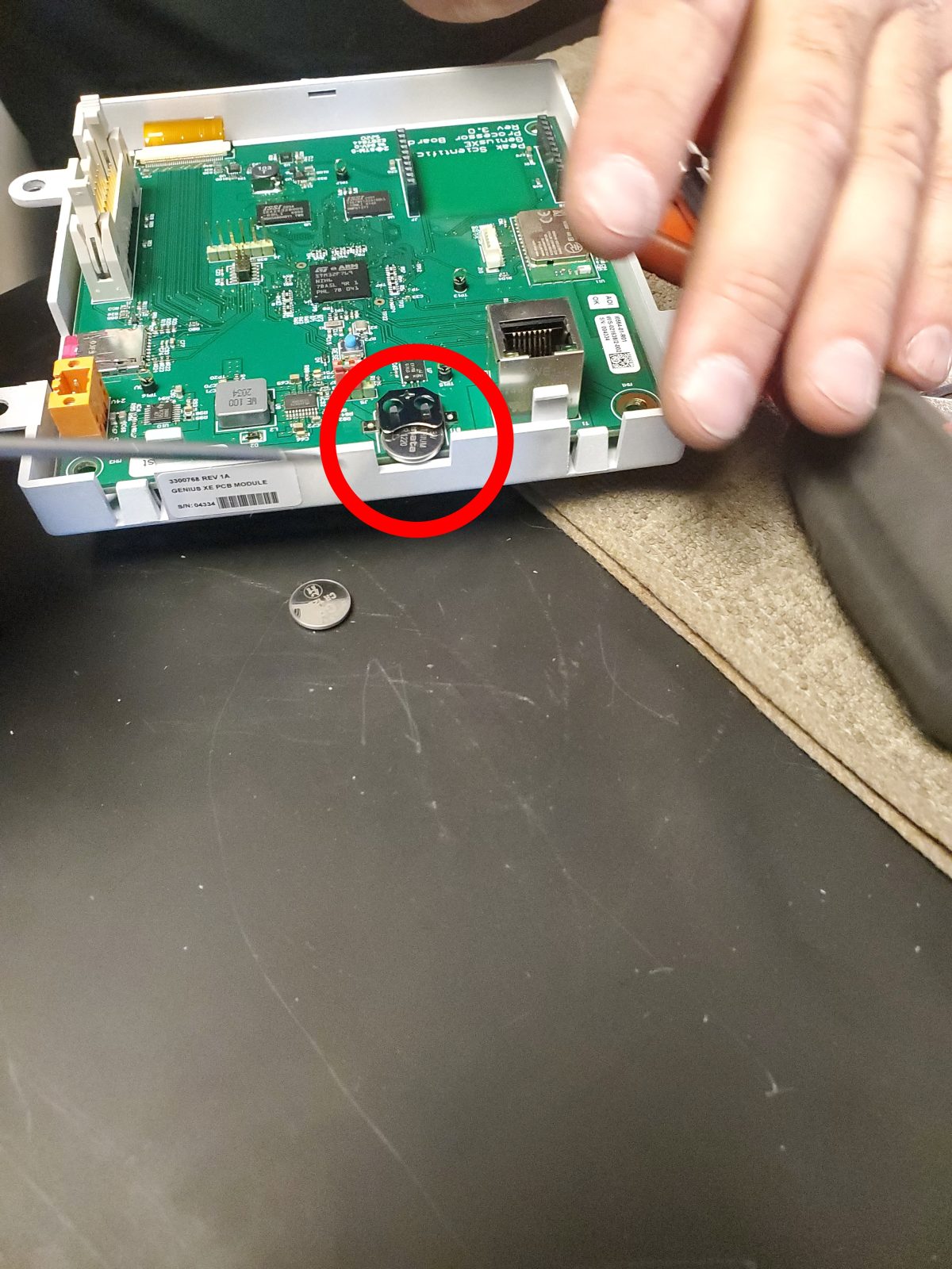 Replace battery. To access, remove nitrogen membranes (they last 5-10 years). Then remove plastic box. Replace battery. Don't touch circuit board. Probably not necessary to replace battery every year.