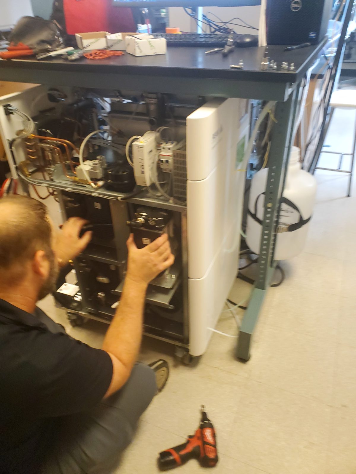 After testing, turn off, release pressure with red valve, Unplug, replace panels. Start with back panel. Then silver panels that cover compressors. Then side panels. Then top panel.