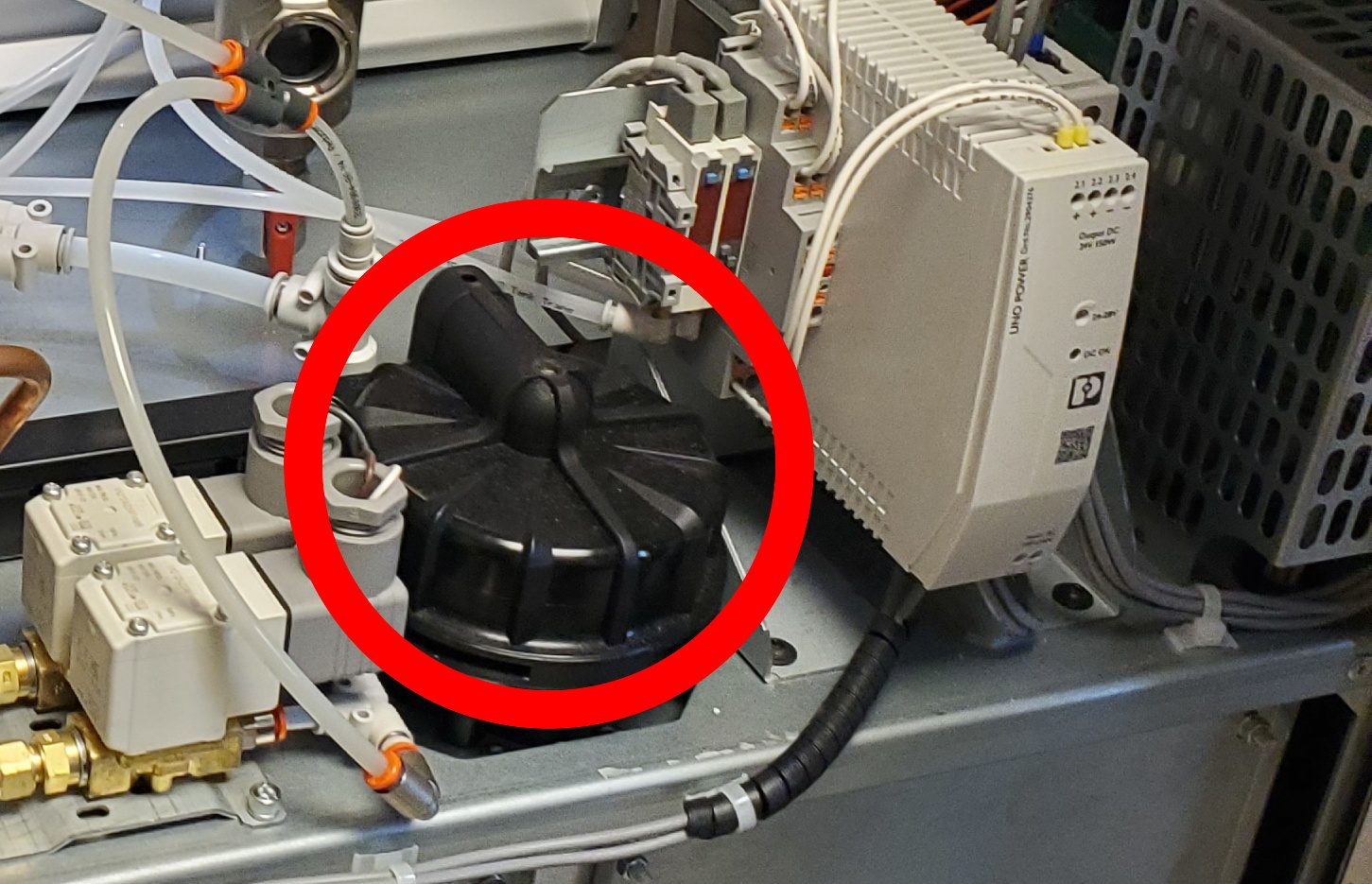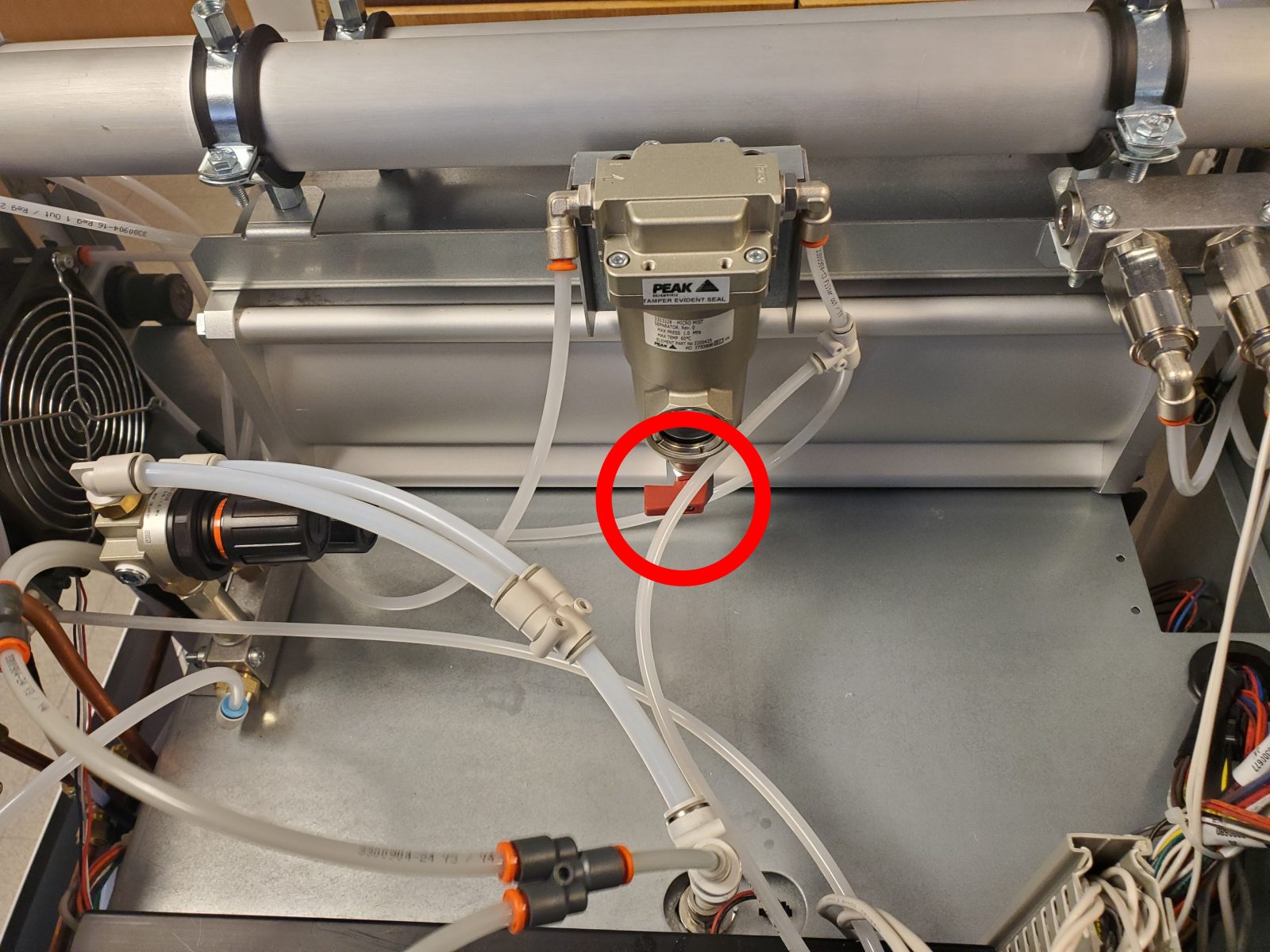 Replace filter and o-rings in 4th filter bowl located on top center, just above the red valve.