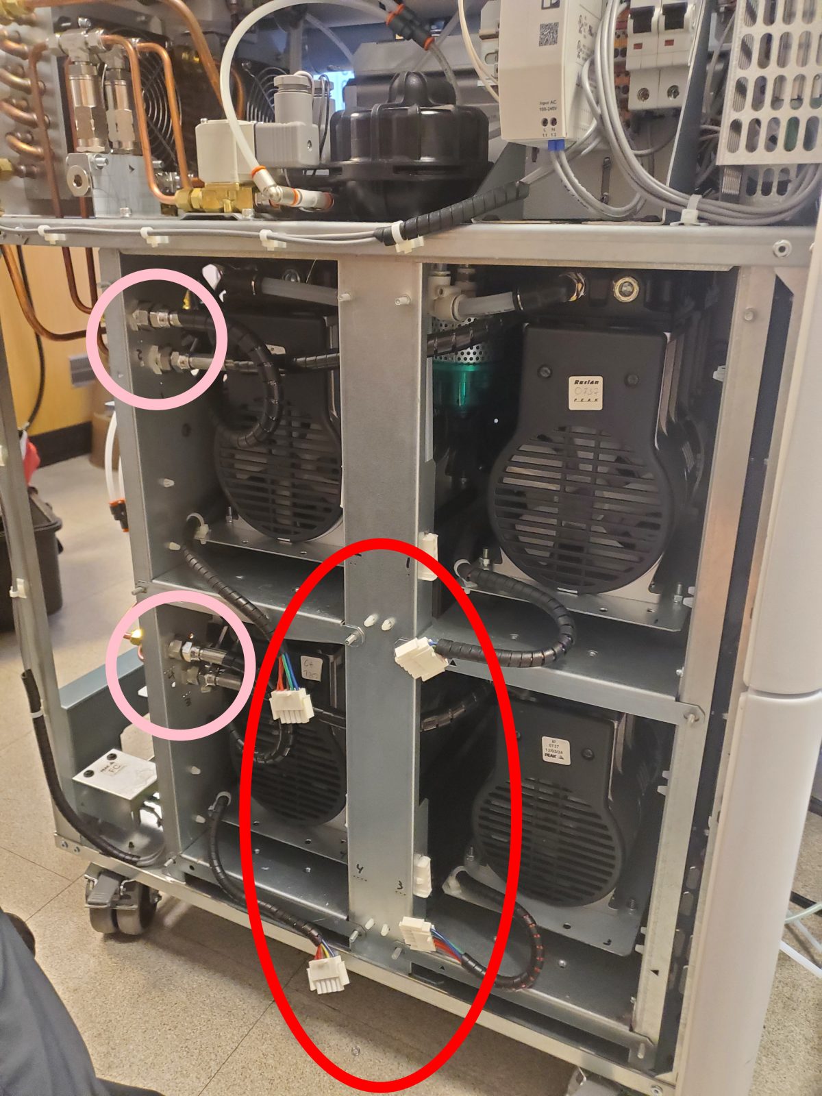 Unplug white plugs (4) - red circle; unscrew black hoses on left (4) - pink circles. Wear gloves, sheet metal is sharp